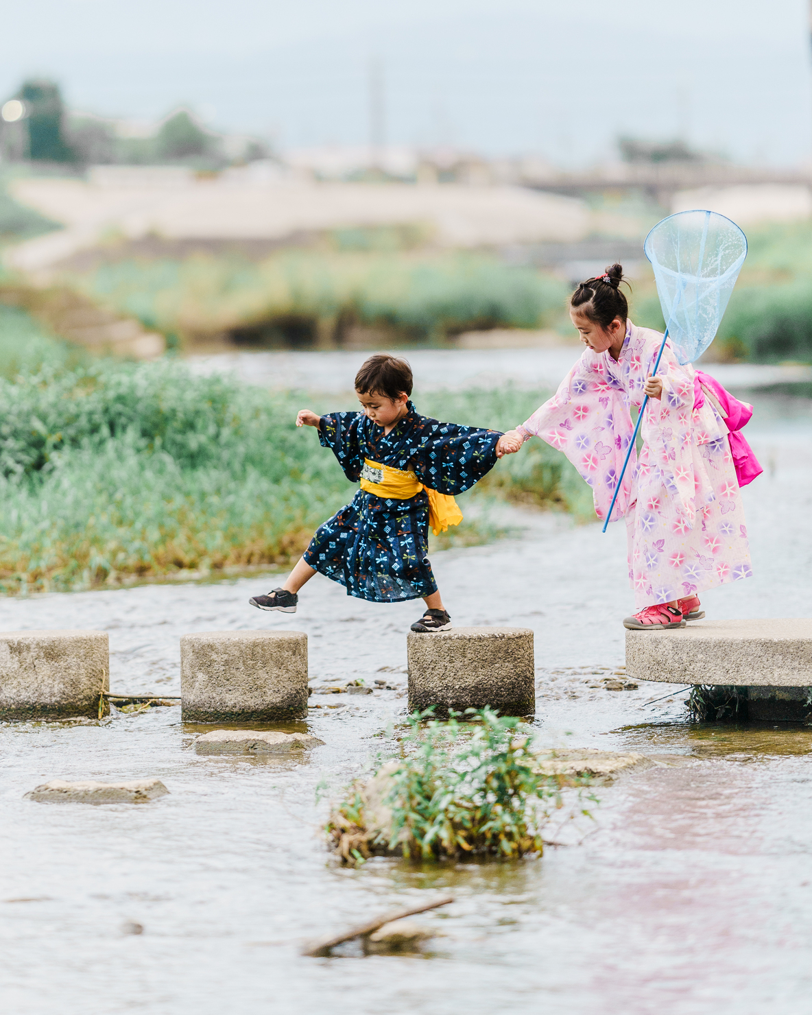 おねえちゃんが、虫網を持ってくれて、手も繋いでくれるから、1人で渡れない飛び石も、渡ることができた瞬間。おねえちゃんのやさしさを捉えた一枚です。