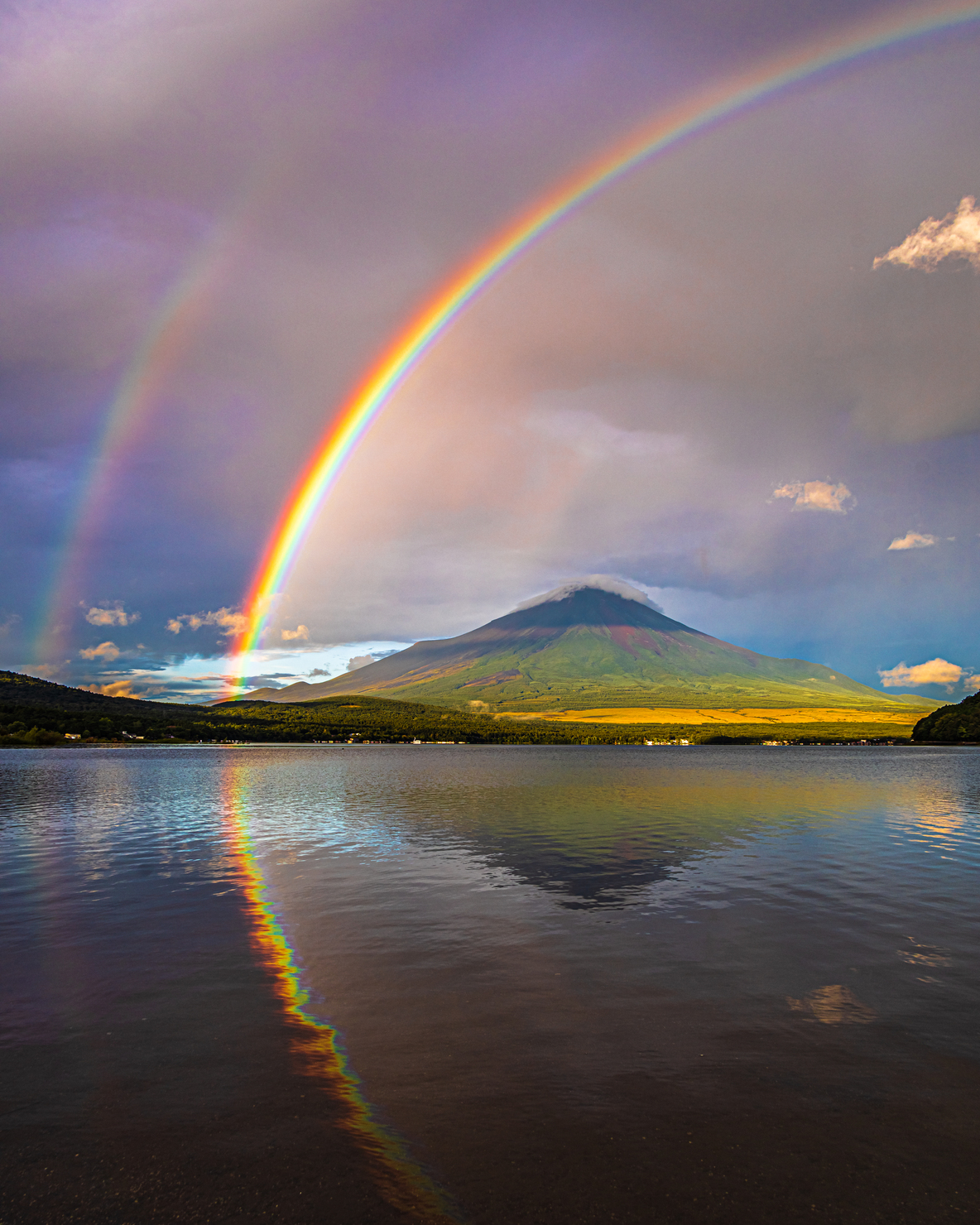 曇天の朝、泣き出しそうな湖畔に佇んでいると朝陽が差し込み霧さぶる彼方に富士山が現れ虹がかかり雨が落ちてきました。