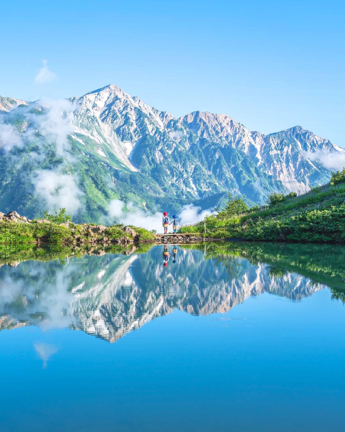 真夏の早朝、空は青く山の空気はひんやりと澄み切っていました。唐松岳の中腹にある八方池の水面には、美しい山々が写し出され、見事な絶景が広がっていました。頑張って登山してきた私たちには最高のご褒美となりました。