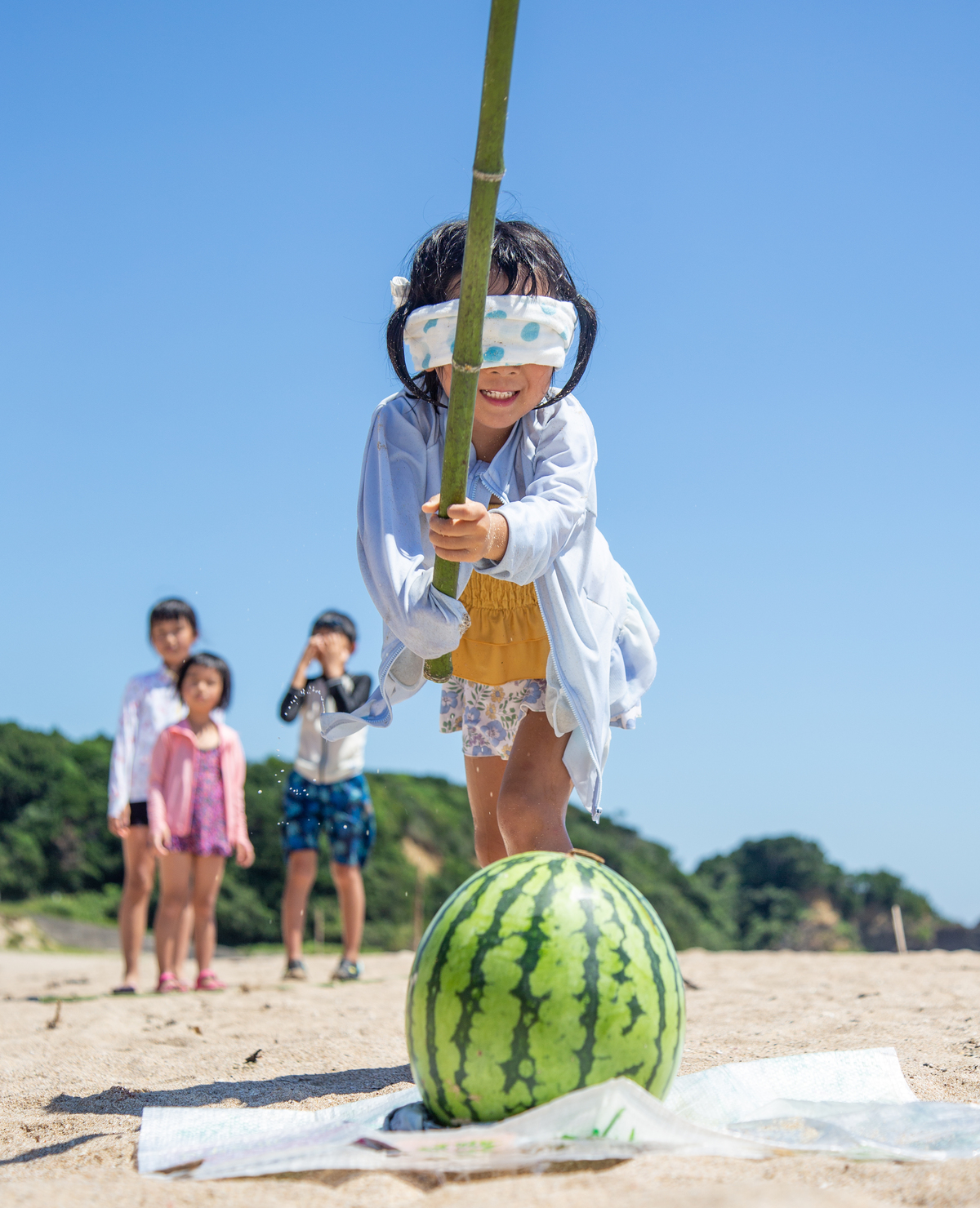 毎年恒例、大好きなお友だちとスイカ割り。目隠しで前が見えないけど、「割れるかな?」と、ワクワクしている娘の様子が伝わると嬉しいです。