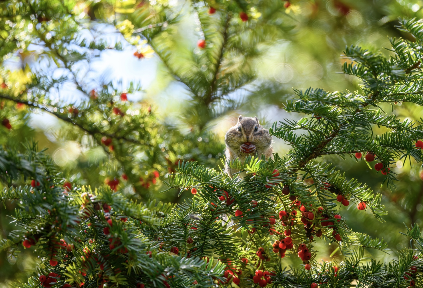 秋深まる北海道。エゾシマリスが忙しそうに冬眠のための冬支度をしてます。イチイの実がたわわに実った木を発見!口いっぱいに詰め込んでいました。