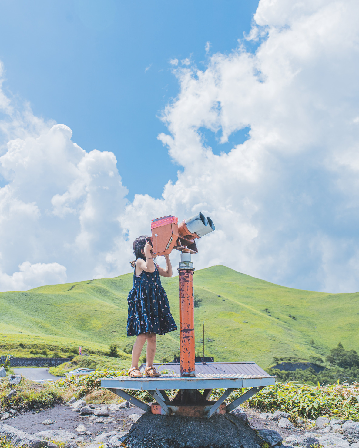 夏休みの帰省中。涼を求めて高原をドライブしていると、この望遠鏡に出会いました。望遠鏡は壊れてしまっていて何も見えませんでしたが、娘にはある伝説の生き物が見えたそうです。子どもの豊かな想像力をこれからも大切にしたいと思った瞬間でした。