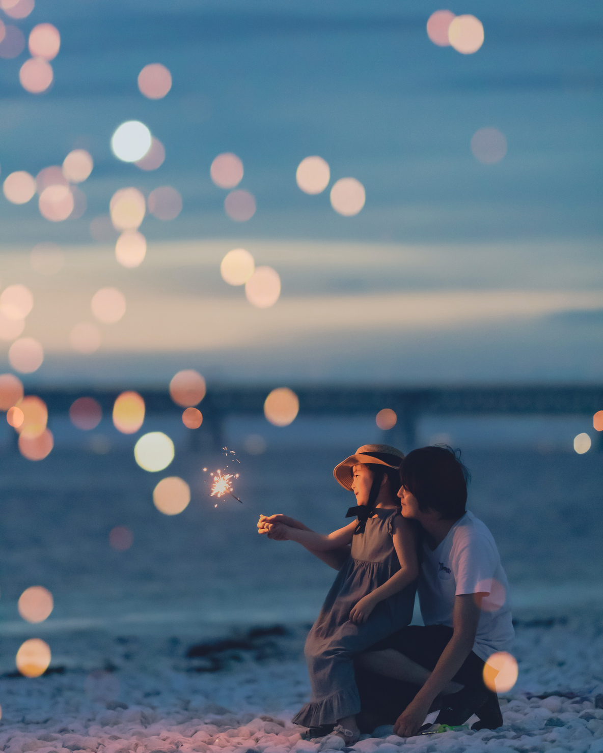 夕暮れの海で手持ち花火をした時の写真です。まだ花火を一人で持つのが怖い娘の後ろからパパが支えてくれた瞬間を撮りました。何をするのもパパが一緒がよかった時期の思い出の一つとして、娘が大人になった時にも見せたい大切な一枚です。