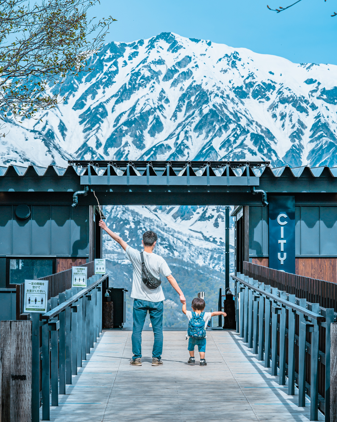 初めて訪れた白馬村。この日はポカポカ陽気で、大迫力の雪山に半袖で対峙する夫と息子の様子に、山々との季節の差を実感しました。美しい景色に浮き足立つ姿が今にも冒険に出発しそうな1枚となりました。