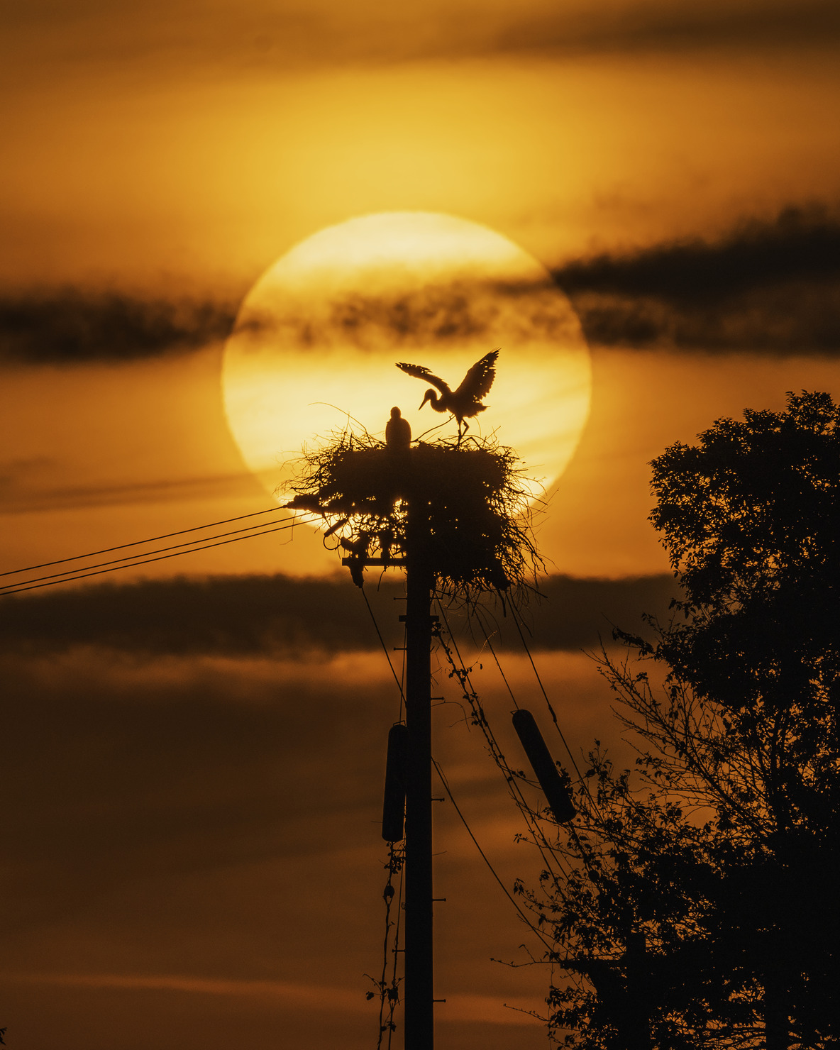 巣立ち前の鳴門コウノトリの幼鳥と朝日が重なる瞬間を撮影しました。薄い雲と太陽、コウノトリが羽を広げるタイミングが揃うまで毎日通った思い入れある1枚です。