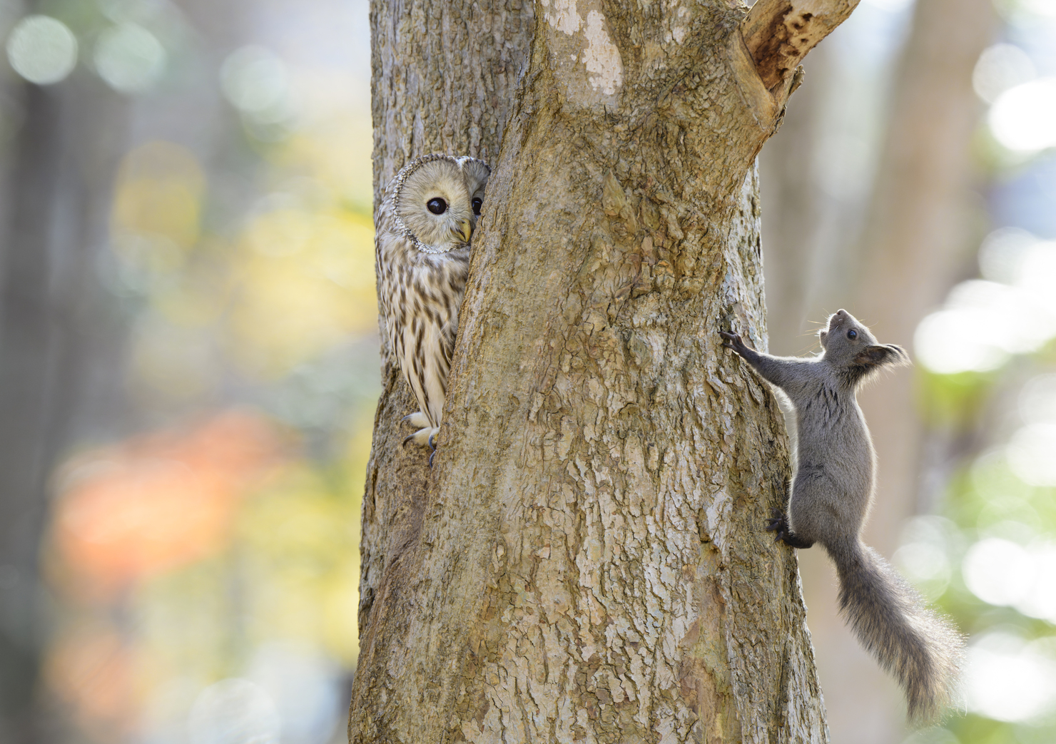 エゾフクロウが佇む木にエゾリスが登ってきました。エゾリスにとっては天敵なので危ういシーンですが、エゾフクロウはお腹が空いていないと狩りをしないことを知っているかのように、からかっているようでした。